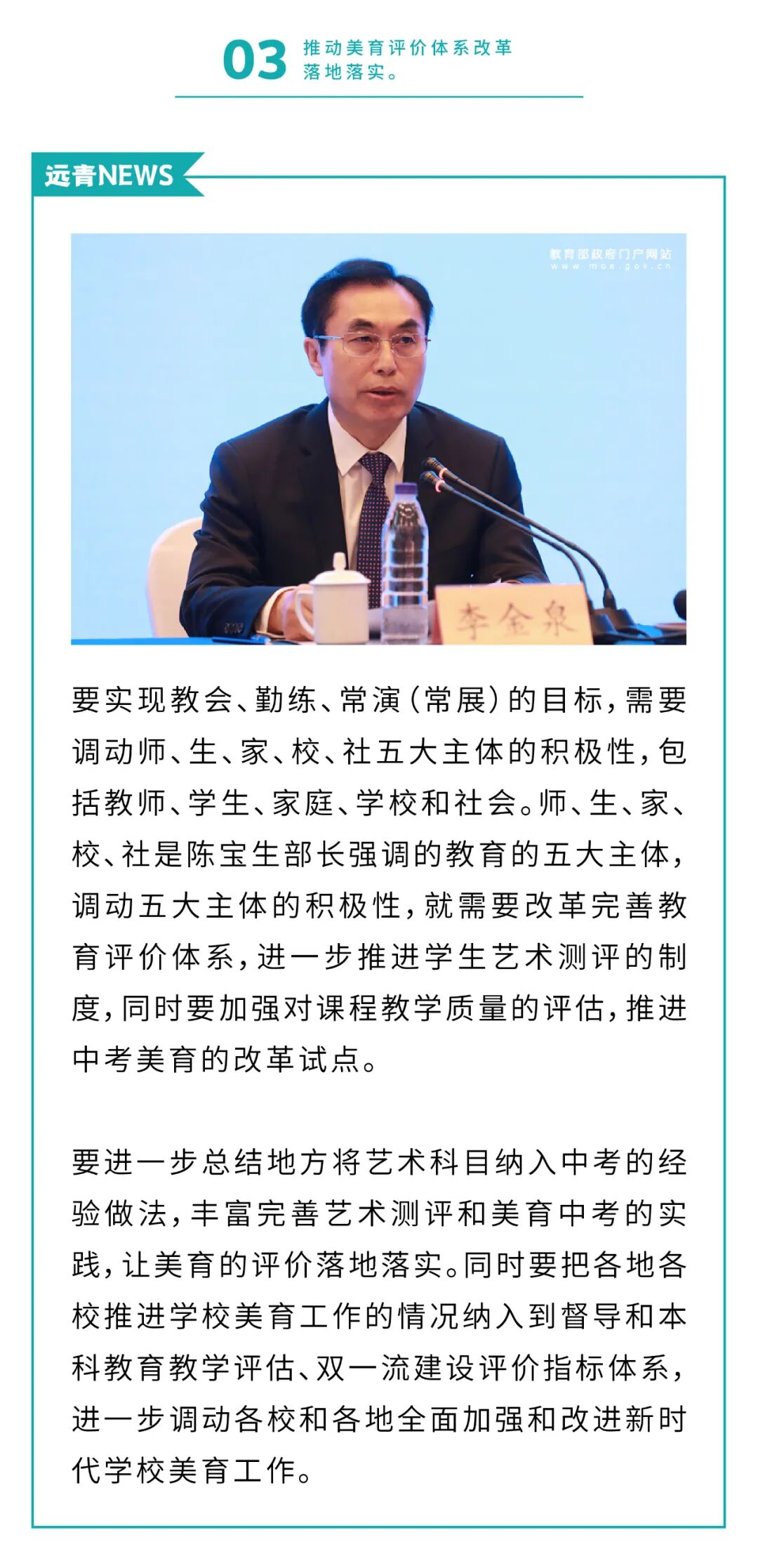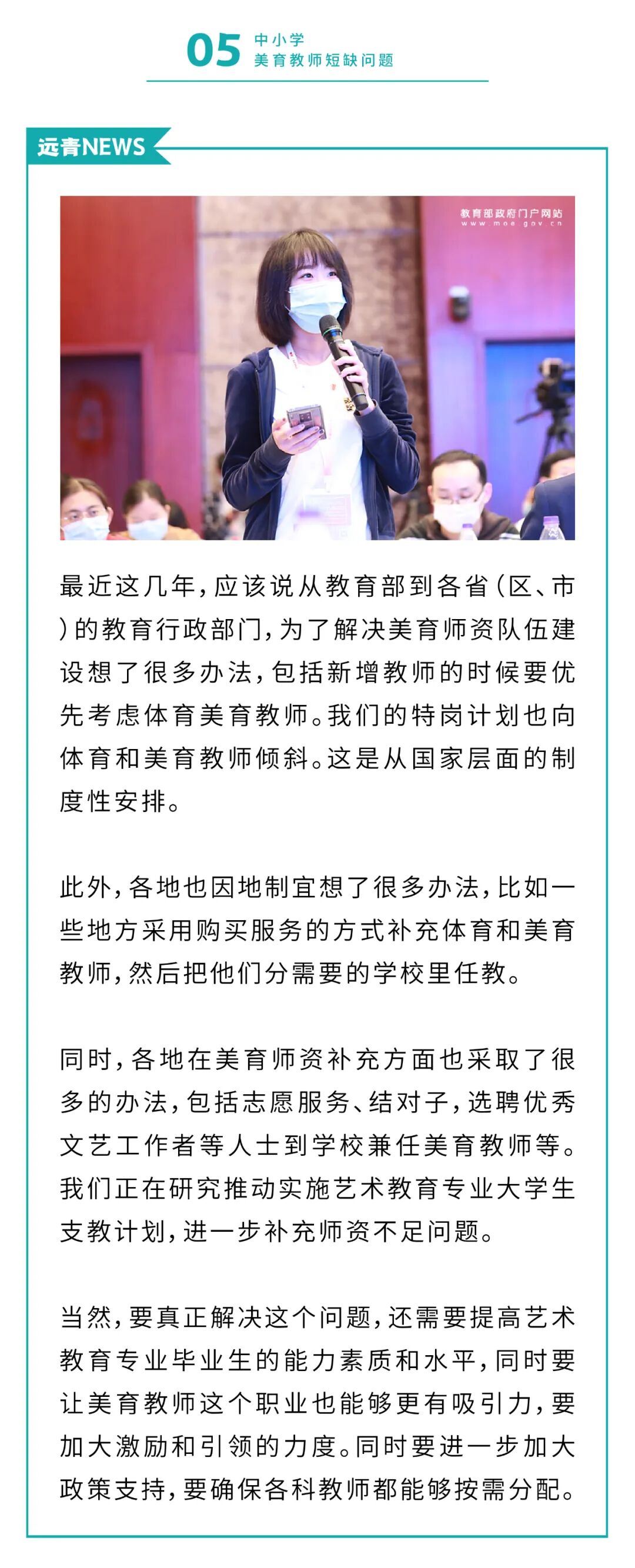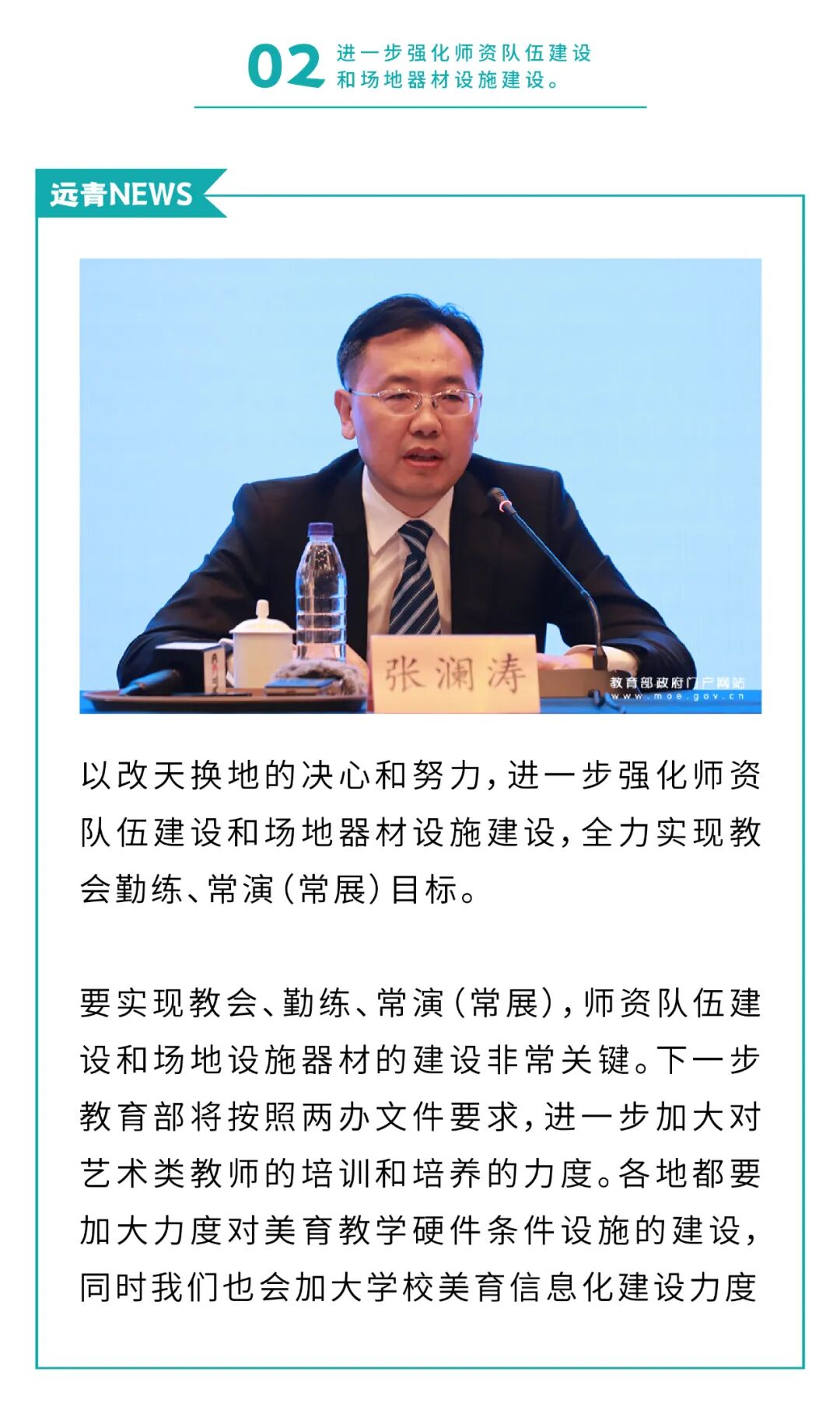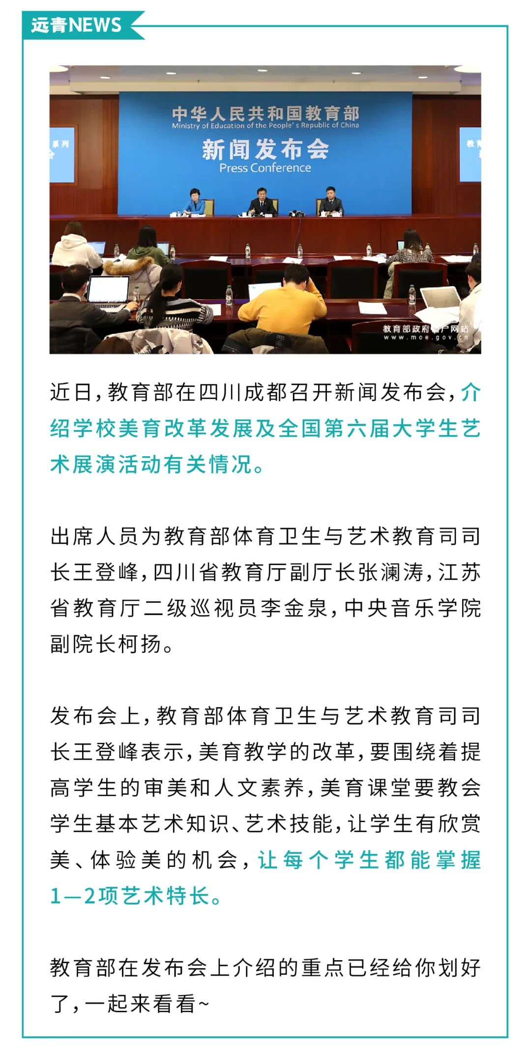 于校长 138-9888-9583|收藏本站|网上报名|设为首页 远青简介 画室环境 远青分部 画室荣誉 许可证书 招生简章 联考班 设计班 造型班 校考班 其他班 教师管理制度 学生管理处罚条例 录取通知 英雄榜 远青记录 校长 专业老师 办公室老师 学生活动 教师活动 餐饮住宿 家长会 远青宣传片 远青学员理想 教师色彩 教师素描 教师速写 教师设计 学生作品 “全家福” 画室新闻 考试信息 优秀试卷 重要通知 网上报名 联系方式 新闻 “全家福” 画室新闻 考试信息 优秀试卷 重要通知 回到首页 最新 招生简章招生简章 远青画室联系方式远青画室联系方式 远青画室食堂篇 远青画室2022届提前批录取公示(持续更新中……) 鲁迅美术学院2022年本科招生录取文化课控制分数线 联系 于校长138-9888-9583 当前位置:远青画室 > 新闻 > 画室新闻 教育部最新发文:要让每个学生都能掌握1—2项艺术特长! mm3000 | 来源:远青画室 | 时间:2021-5-20 文章转载自教育部官网
